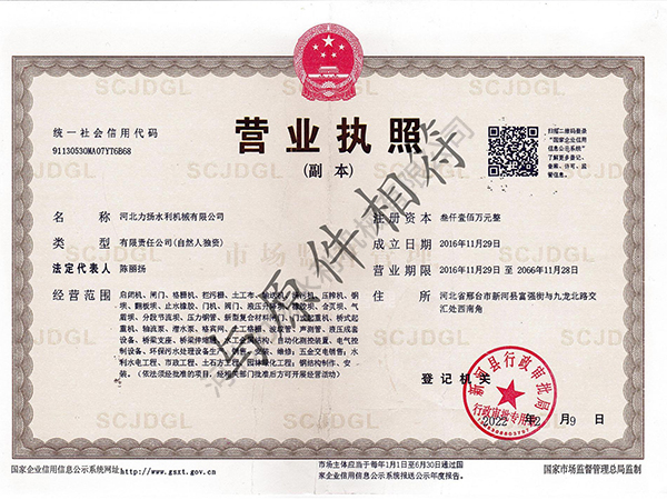 河北力揚水利機械有限公司,成立于2016年,地址河北省邢臺市新河縣富強街與九龍北路交匯處西南角具備生產及供應、安裝能力。我們公司位于董振堂將軍故里,河北省邢臺市新河縣九龍工業區,是一家集設計、生產、銷售、安裝、售后一體的綜合性水利機械廠家,現有人員共40余名,獲有國家頒發的全國工業產品生產許可證、ISO質量管理體系認證、環境體系認證、職業健康體系認證并且我公司通過水利相關部門水工金屬結構質量檢驗中心的考核和監督下獲得了:認證頒發的四項產品認證證書(平面閘門、弧形閘門、回轉式清污機、耙斗式清污
